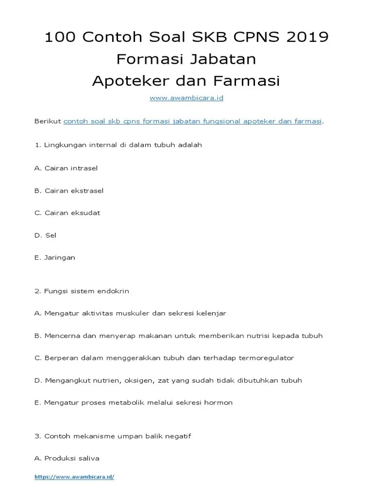 Kumpulan soal latihan dan pembahasan tes cpns twk, tiu dan tkp (pdf) tahun 2021/2022. Kemudian waktu tunggu yang dibutuhkan untuk sekali pemesanan yaitu 3 hari. Berusia 35 tahun telah menderita hipertiroid selama 5 tahun, ibu tersebut menyusui dan datang ke suatu rumah sakit memeriksakan diri kepada dokter dengan keluhan mengalami tremor yang cukup parah. apoteker harus memastikan tidak terjadi kekosongan stok amlodipin karena merupakan pemakaian obat terbanyak. Pendaftar akan menjalani serangkaian seleksi administrasi dan seleksi ujian tulis sebelum dinyatakan terdaftar sebagai aparatur sipil negara (asn).