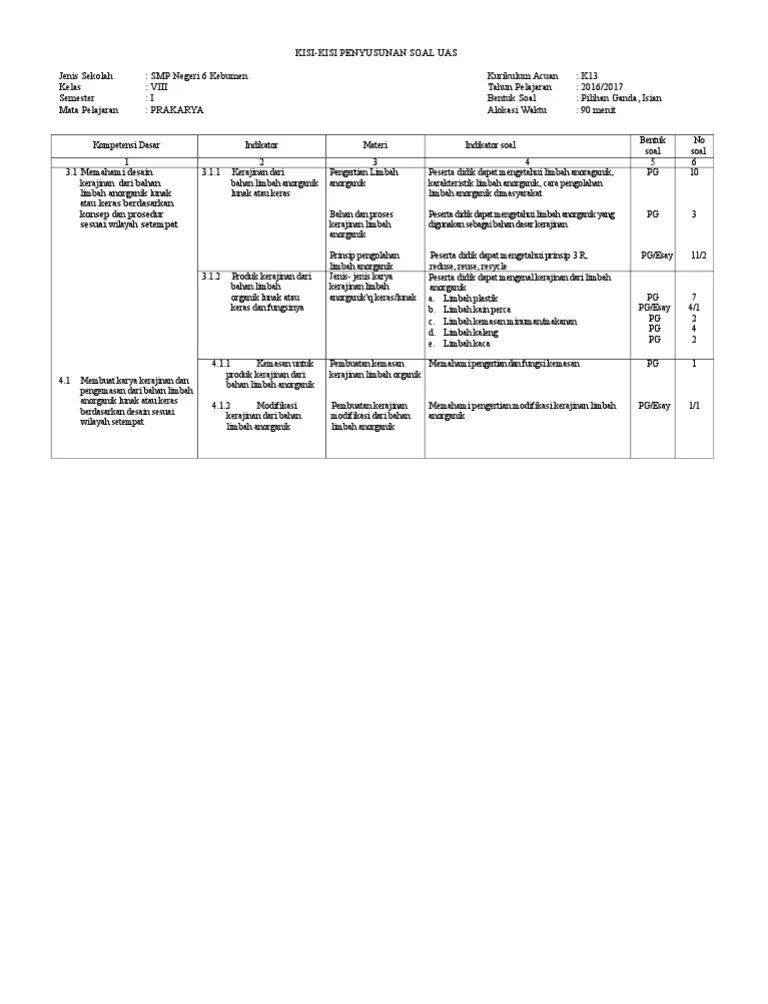 Contoh Kisi-Kisi Soal Prakarya - Kisi Kisi Pat Prakarya Kelas 7 Kurikulum 2013 Tahun 2021 : Kisi kisi soal prakarya kelas 7 docx cute766.